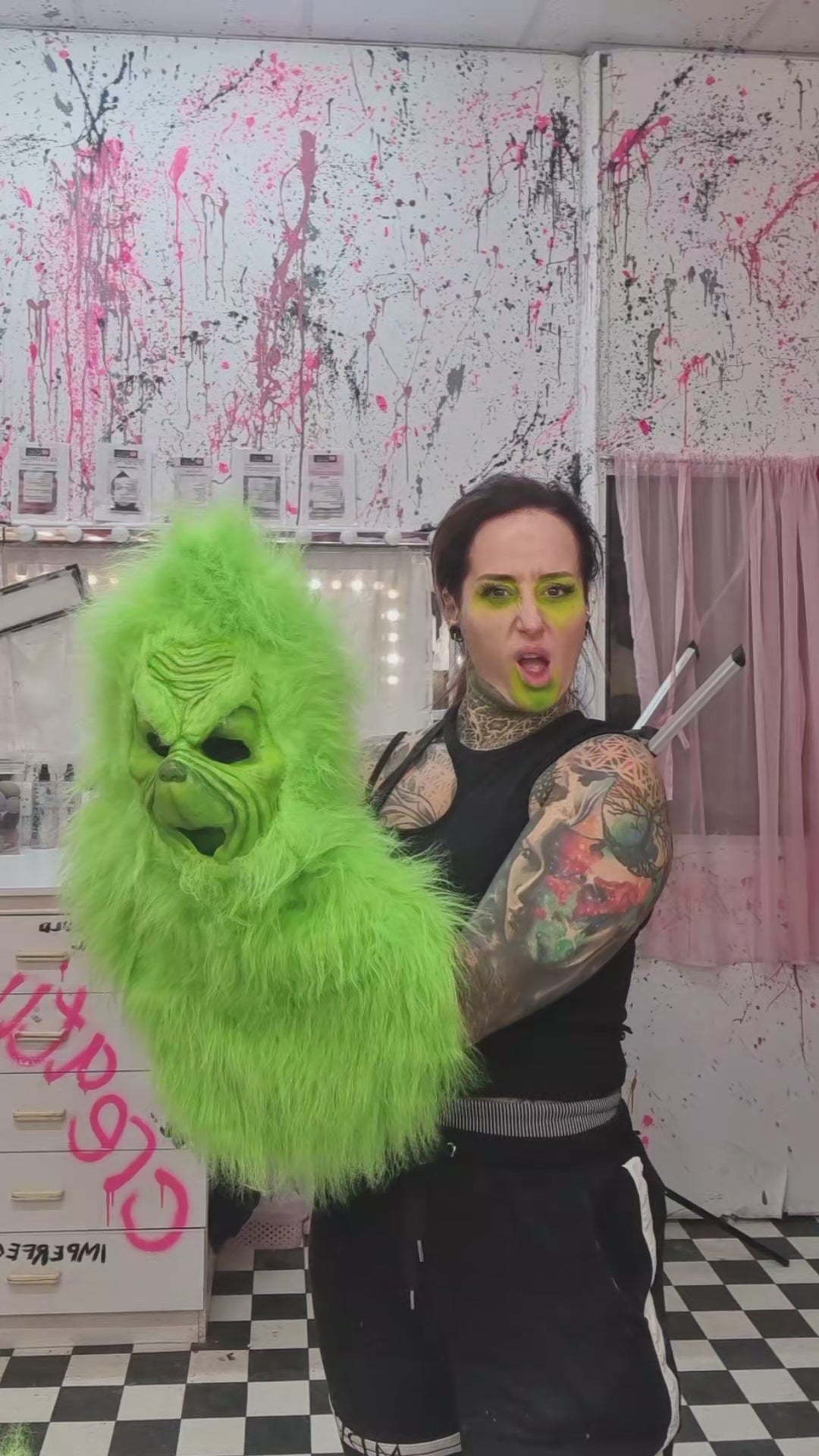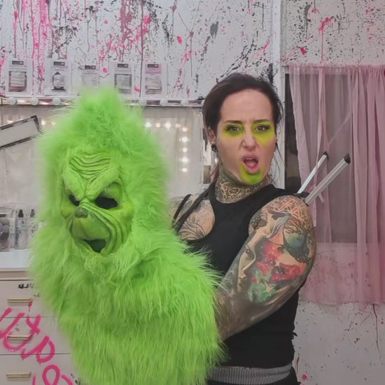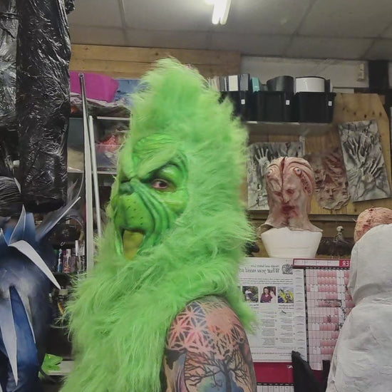 GREEN PULL-OVER GRINCH MASK WITH FUR HOOD
