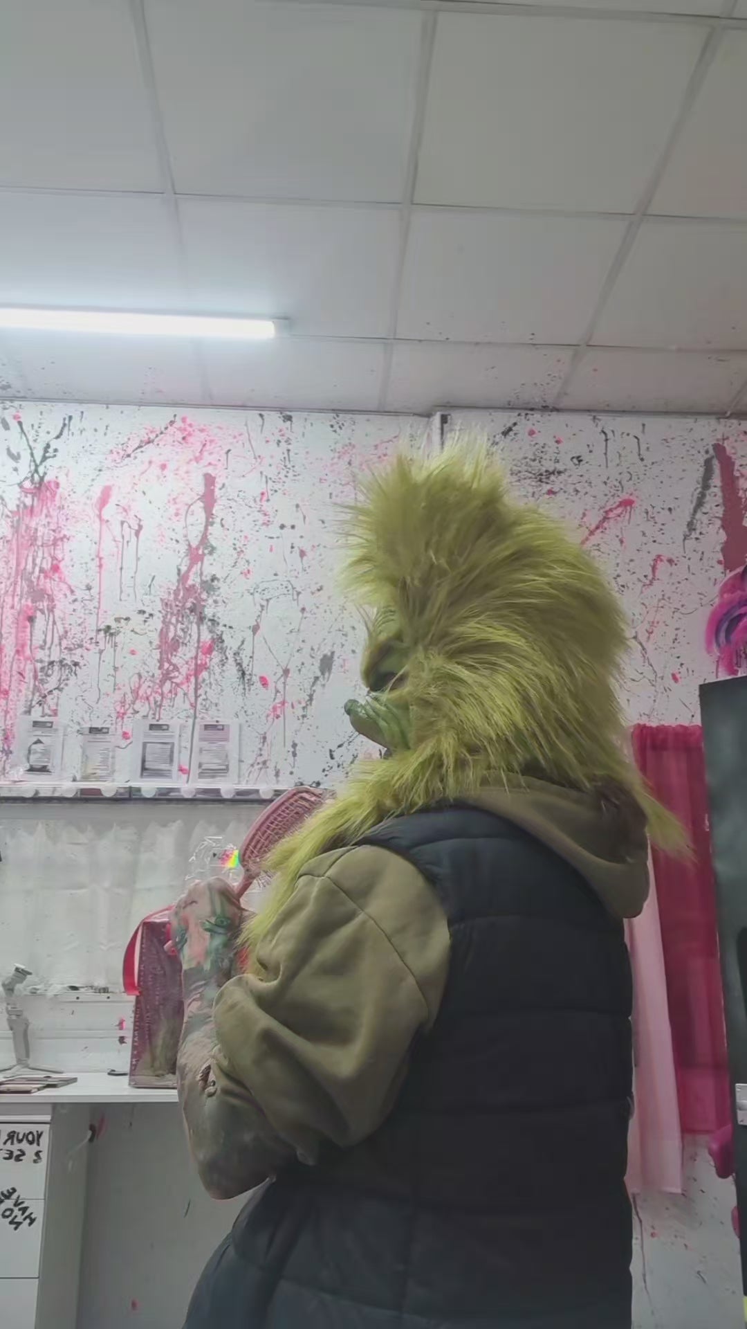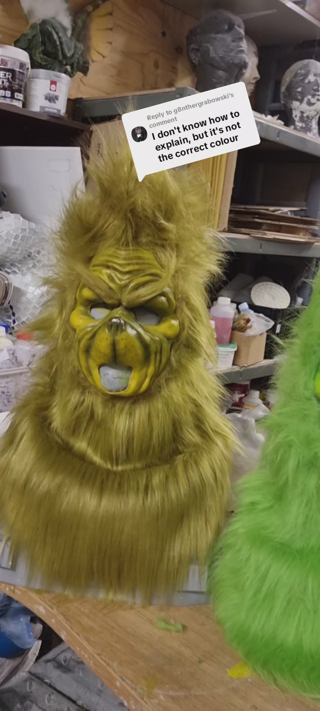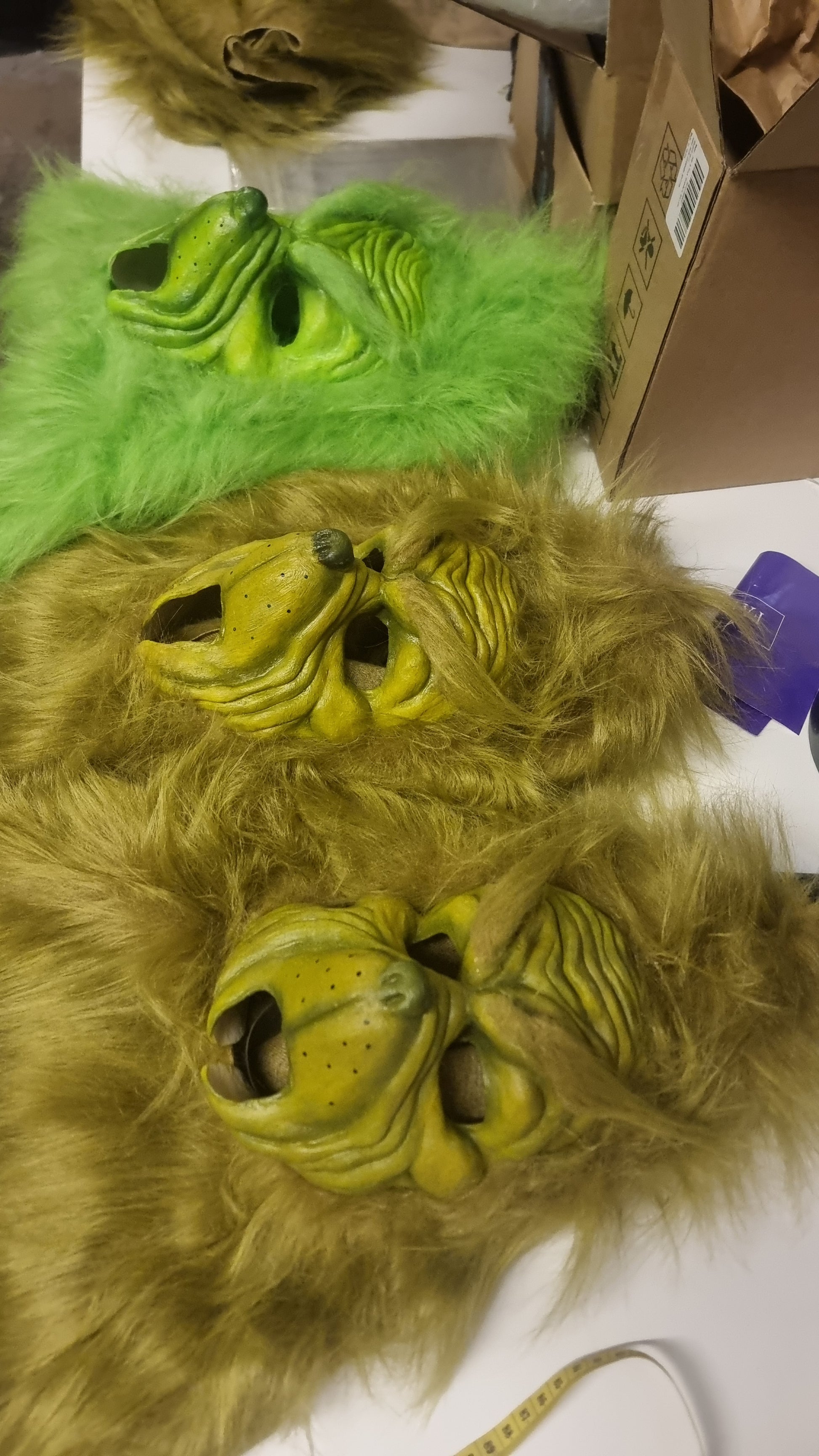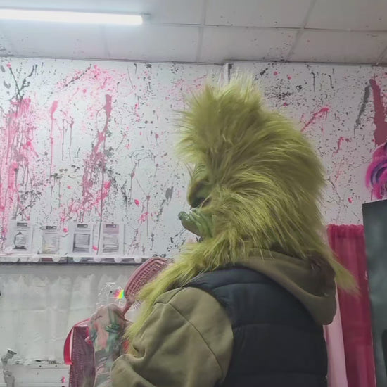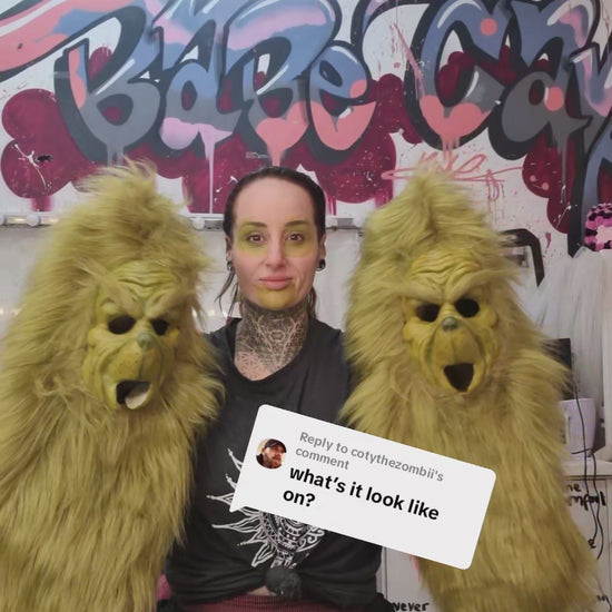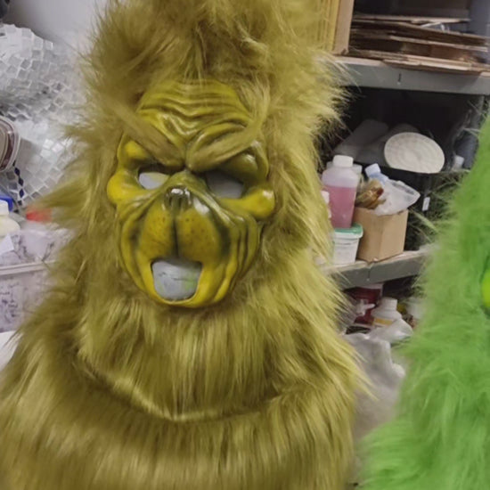 This pull-over mask features a long hair faur fur hood and is available in olive or lime green. Its simple pull-over design ensures comfort while adding a playful, festive touch. Due to the intricate craftsmanship involved, please allow at least 7 days for production. If you have a tight deadline, don’t hesitate to contact us in advance. We do cut the mouth out so you have movement, but we can leave that in for a more static appearance. Just add it to your order notes for any changes. Paint and style may vary as we do make them hand made but we try ti duplicate the look from the original character and match the fur colour you choose.